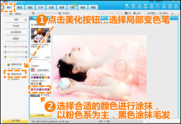 6、继续在“美化”菜单下,选择“局部变色笔”功能,选择合适的颜色进行涂抹,主要以粉色系为主,黑色涂抹毛发,可以让色彩更加唯美梦幻!