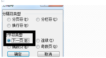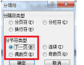 3、在弹出的窗体中选择分节符类型,分节符类型选择下一页,如图所示。