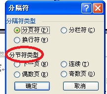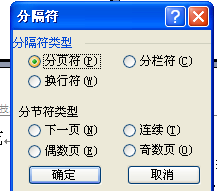 在其中的“ 分节符类型” 中有四个类型:① 下一页② 连续③ 偶数页④ 单数页。“ 下一页” 表示分节符后的文本从新的一页开始;“ 连续” 表示分节符后的文本出现在同一页上;“ 偶数页” 表示分节符后的文本从下一个偶数页开始;“ 单数页” 表示分节符后的文本从下一个奇数页开始。根据自己编排的需要选择一项,按“ 确定” 退回到文档中。你可以根据需要按照此法将文档分为多个不同的节。