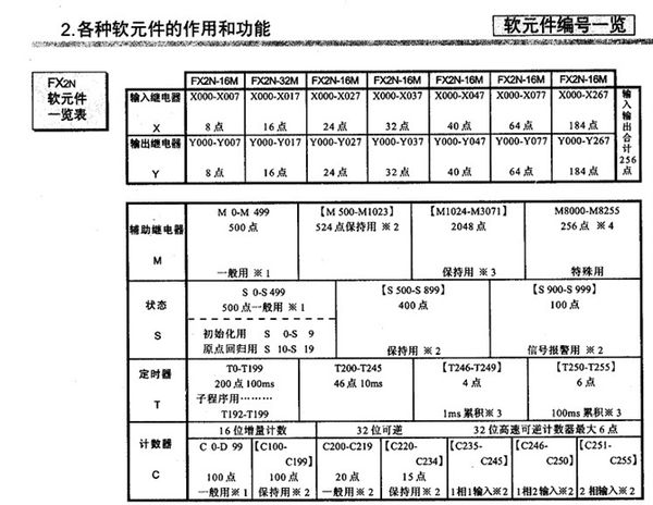 第七节 FX系列PLC的编程元件不同厂家、不同系列的PLC,其内部软继电器的功能和编号都不相同,因此在编制程序时,必须熟悉所选用PLC的软继电器的功能和编号。 FX系列PLC软继电器编号由字母和数字组成,其中输入继电器和输出继电器用八进制数字编号,其它软继电器均采用十进制数字编号。一、数据结构及软元件(继电器)概念1、数据结构1)十进制数2)二进制(在FX系列PLC内部,数据是以二进制(BIN)补码的形式存储,所有的四则运算都使用二进制数)。3)八进制(输入继电器、输出继电器的地址采用八进制)4)十六进制、5)BCD码6)常数K、HK:十进制常数H:十六进制常数2、软元件(编程元件、操作数) 1)软元件概念PLC内部具有一定功能的器件(输入、输出单元、存储器的存储单元)。 2)分类:位元件、字元件①位元件 X:输入继电器,用于输入给PLC的物理信号;Y:输出继电器,从PLC输出的物理信号;M(辅助继电器)和S(状态继电器):PLC内部的运算标志。说明:A、位单元只有ON和OFF两种状态,可用“0”和“1”表示。B、元件可以通过组合使用,4个位元件为一个单元,通用表示方法是由Kn加起始的软元件号组成,n为单元数。例如K2 M0表示M0~M7组成两个位元件组(K2表示2个单元),它是一个8位数据,M0为最低位。 ②字元件数据寄存器D:模拟量检测以及位置控制等场合存储数据和参数。 字节(BYTE)、字(WORD)、双字(DOUBLE WORD)二、FX系列PLC的编程元件 (一)输入继电器(X) 作用:用来接受外部输入的开关量信号。输入端通常外接常开触点或常闭触点。 编号:X000 ~ X007 X010 ~ X017 ······说明:1)输入继电器以八进制编号。FX2系列PLC带扩展时最多可有184点输入继电器(X0 ~ X267)。 2)输入继电器只能输入驱动,不能程序驱动 3)可以有无数的常开触点和常闭触点。 4)输入信号(ON、OFF)至少要维持维持一个扫描周期。 (二)输出继电器(Y)作用:输出程序运行的结果,驱动执行机构控制外部负载。编号:Y000 ~ Y007 Y010 ~ Y017······说明:1)输出继电器以八进制编号。FX2系列PLC带扩展时最多可有184点输入继电器(Y0 ~ Y267)。 2)输入继电器只能程序驱动,不能外部驱动 3)输出模块的硬件继电器只有一个常开触点,梯形图中输出继电器的常开触点和常闭触点可以多次使用。 (三)辅助继电器(M):中间继电器 辅助继电器是用软件实现,是一种内部的状态标志,相当于继电器控制系统中的中间继电器。说明:1)辅助继电器以十进制编号。 2)辅助继电器只能程序驱动,不能接收外部信号,也不能驱动外部负载。 3)可以有无数的常开触点和常闭触点。 辅助继电器:通用型、掉电保持型和特殊辅助继电器三种。1、通用型辅助继电器:M0~M499 共500个特点:通用辅助继电器和输出继电器一样,在PLC电源断开后,其状态将变为OFF。当电源恢复后,除因程序使其变为 ON外,否则它仍保持OFF。用途:中间继电器(逻辑运算的中间状态存储、信号类型的变换)。2、掉电保持型辅助继电器:M500~M1023 特点:在PLC电源断开后,保持用辅助继电器具有保持断电前瞬间状态的功能,并在恢复供电后继续断电前的状态。掉电保持是由PLC机内电池支持。3、特殊辅助继电器:M8000~M8255 特点:特殊辅助继电器是具有某项特定功能的辅助继电器。分类:触点利用型和线圈驱动型。1)触点型特殊辅助继电器:其线圈由PLC自动驱动,用户只可以利用其触点。 2)线圈型特殊辅助继电器:由用户驱动线圈,PLC将作出特定动作。 1)运行监视继电器:M8000 —— 当PLC处于RUN时,其线圈一直得电M8001 —— 当PLC处于STOP时,其线圈一直得电