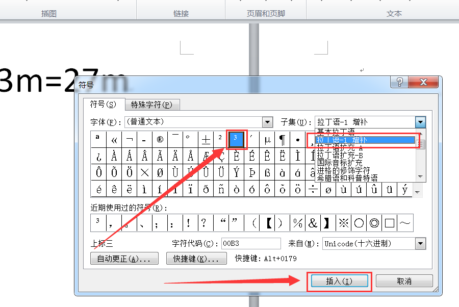 4、找到并点击选择上标“³”,然后点击下面“插入”按钮即可。