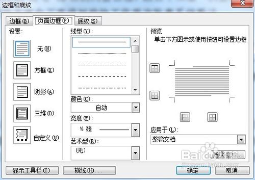 3、打开“边框和底纹”对话框,从中找到“页面边框”选项卡。