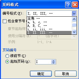 4、弹出页码格式对话框,在编号格式处选择罗马数字格式;在页码编号处选择起始页码,输入框中输入1;