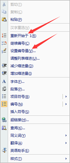 2、如果仍然不起作用,则放编号上右键,选择“设置编号值”来手动输入编号“1”。