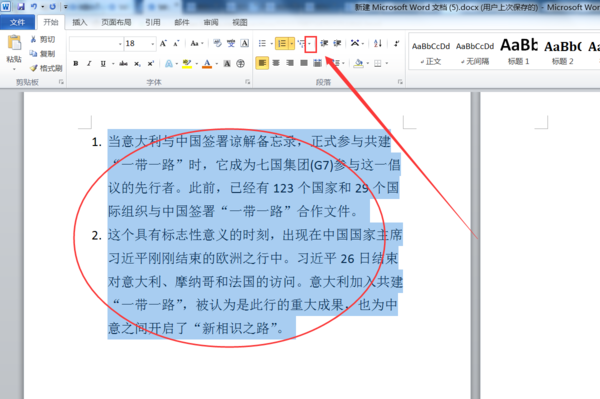 1、打开需要操作的WORD文档,选中需要设置为二级标号的段落文本,点击段落选项中“级别编号”后面的下拉按钮。