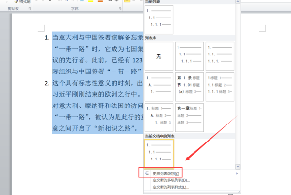 第二级1.1艺术团这个word中没有默认的,一般会是1.艺术团的形式,这里需要选中此行,右击,探出的快捷菜单中选择“编号”--“定义新的编号格式”,探出的对话框中,将“1.”改为“1.1”即可