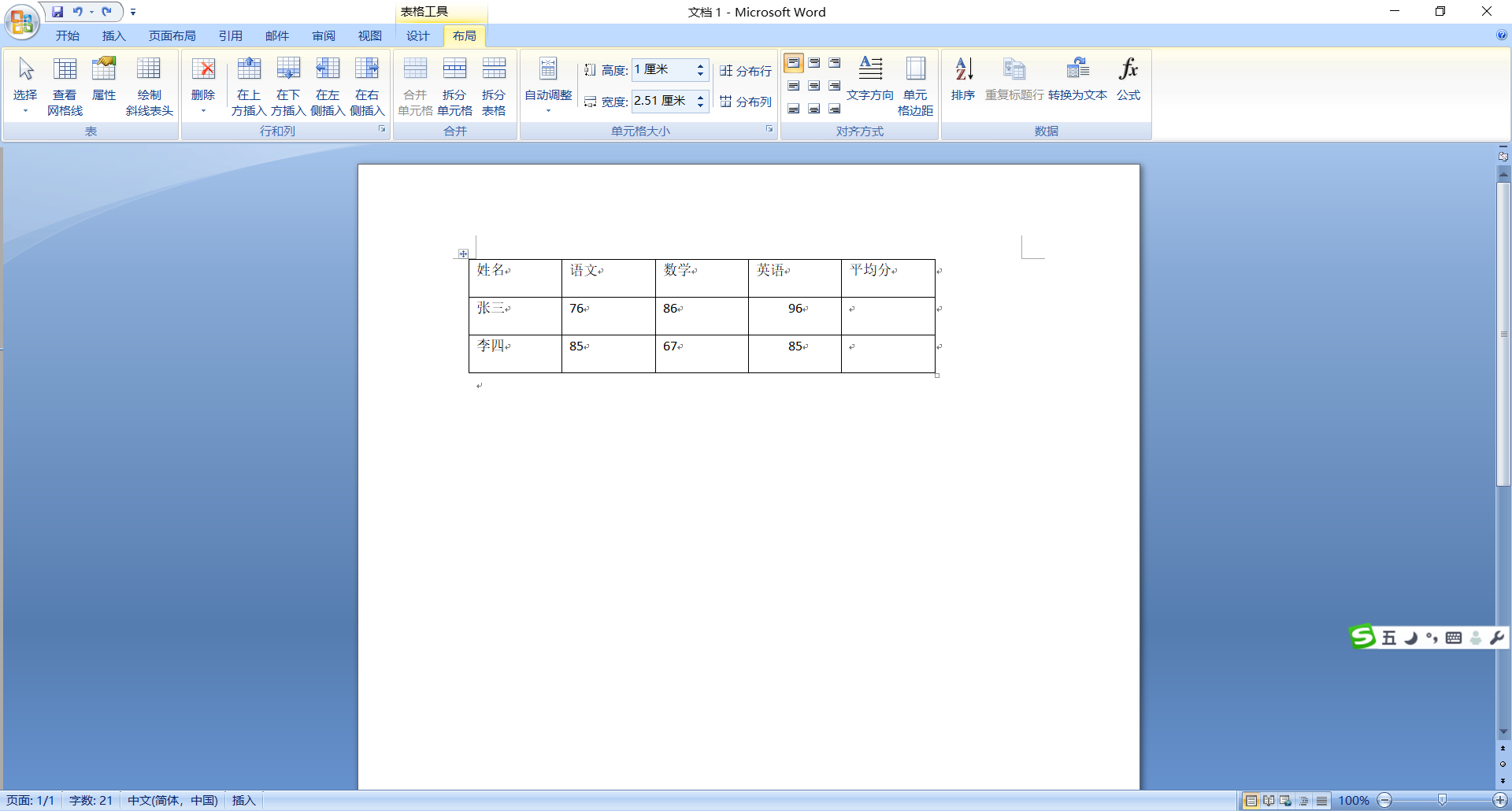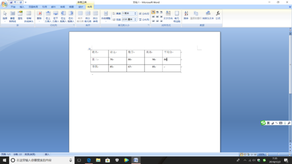 1、打开word文档,在文档输入人名、各科成绩、平均值等。