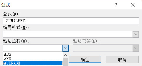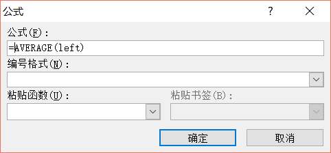 6.在等号后面输入“AVERAGE(LEFT)”/“AVERAGE(ABOVE)”。点击“确定”。