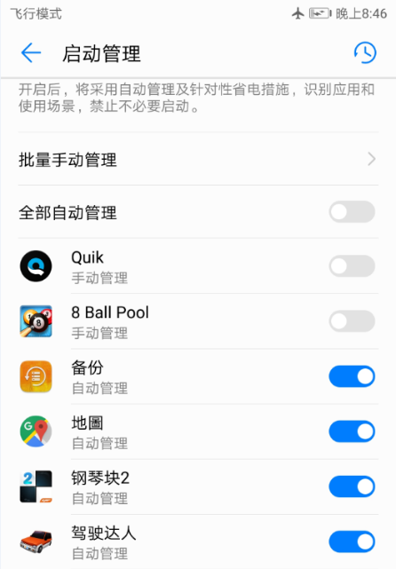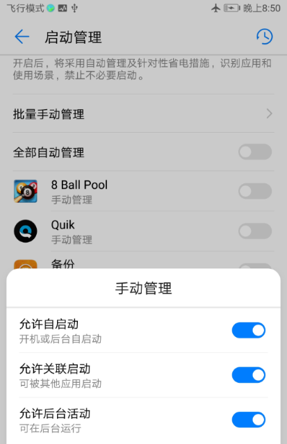 进入设置>电池>启动管理,可以根据需要针对各个应用的“自启动“,”关联启动“,”后台活动“进行管控。