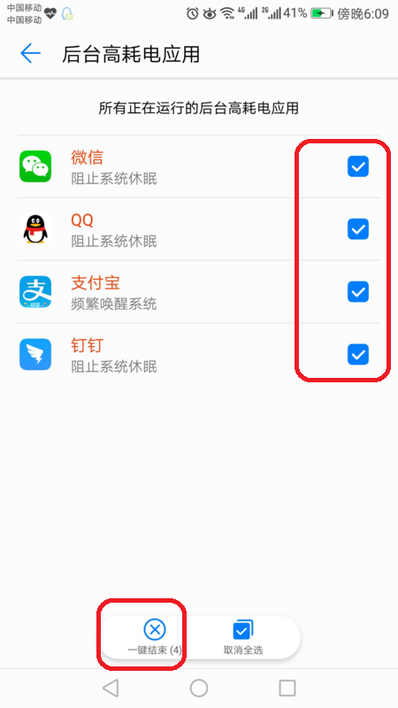 四、进入后台高耗电应用以后,将要结束的应用勾选上,然后点击一键结束即可。