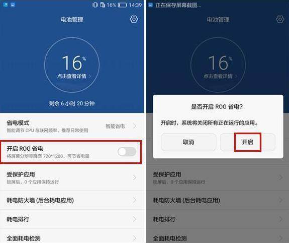 2.打开ROG省电:打开电池管理界面,开启ROG省电就可以了。它是通过降低手机的分辨率,从而提升电池续航能力,延长电池的使用寿命。