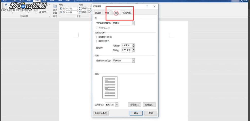 5、点击“页面设置”一栏右下角的按钮,在弹出的对话框中点击“版式”。