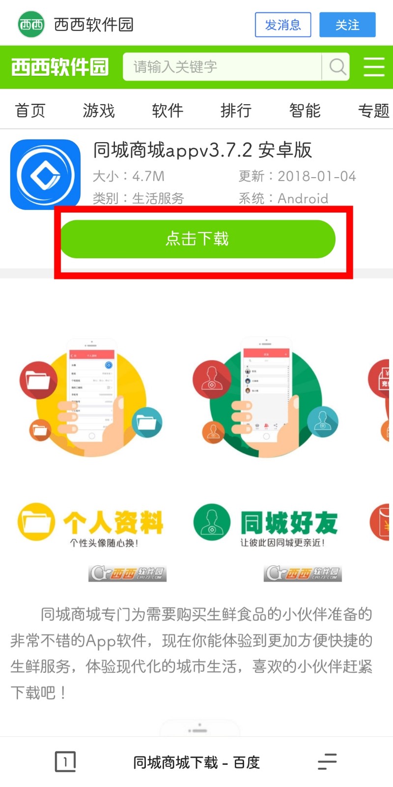 1、在手机软件市场里面搜索同城商城并点击下载按钮进行下载安装完成。