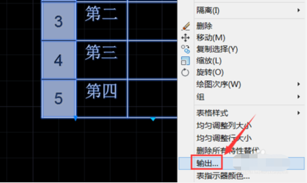 6、指定插入点以后,在绘图区里就出现了表格,选择该表格单击鼠标右键,在弹出的右键菜单里找到输出选项,如图所示:
