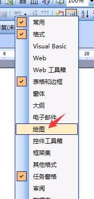 1、查看工具栏中有没有绘图工具栏,如果没有,可以在任何一个工具栏上右击鼠标,选择“绘图”选项,这时绘图工具栏就显示出来,如图所示: