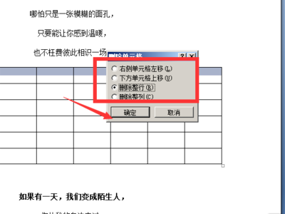 4.选择删除单元格的方向,选择不影响其他表格或文字的方式,点击确定,这样选中的这行单元格被删除。