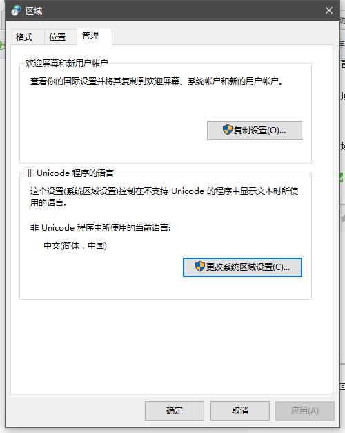 打开“区域”切换到“管理”选项卡,点击“更改系统区域设置”,将当前系统区域设置为“中文(简体,中国)”,确定后重启即可解决部分程序出现乱码的问题。