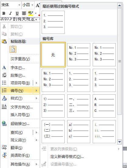 2、选择编号那一行,鼠标左键点击定义新编号格式;