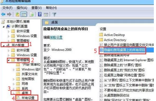 2、在计算机配置下,依次展开用户配置——管理模板——桌面——所有设置,在右侧找到并双击打开“隐藏和禁用桌面上的所有项目”,如图:
