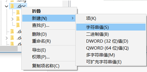 6、右键点击“.doc”选择新建,再选择字符串值。