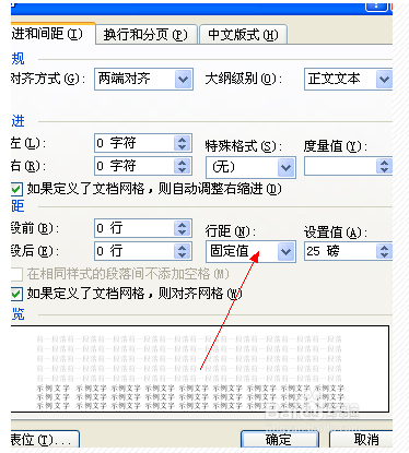 在弹出的对话框中找到间距那一栏的行距进行设置,在下拉选项中选择“固定值”,在“设置值”中输入数值,如25磅。