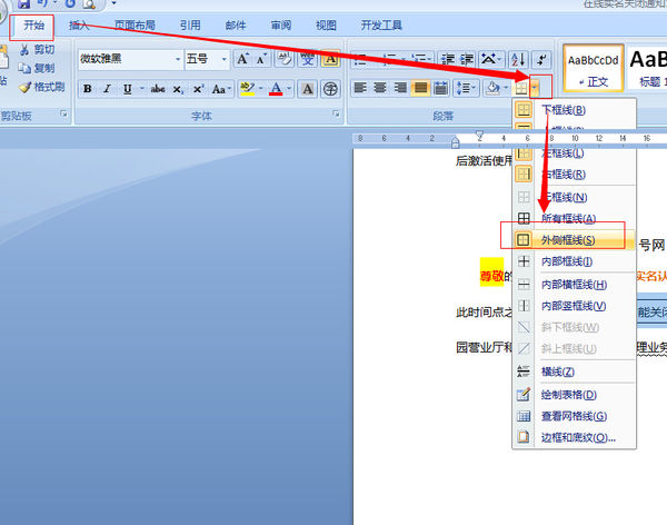 2)OFFICE 开始菜单,点击“边框”工具栏,弹出边框选项。