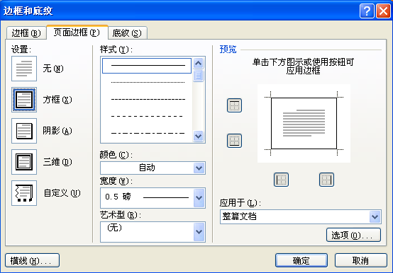 2、然后选择“方框”选项,选择所需的线型以及颜色和宽度,还可以打开“艺术型”,选择你想要的边框图案,点击“确定”。