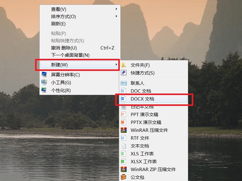 1、在桌面上击右键,选择“新建-Word文档”菜单项;