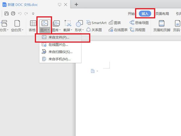 2、在打开的Word软件页面中,点击顶部“插入”菜单,选择“图片-来自文件”选项;