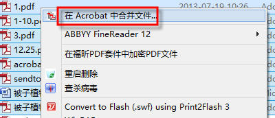 全选需要合并的文件-→右键菜单“在acrobat中合并文件”-→在随后的窗口中调整文件的前后位置-→合并文件。