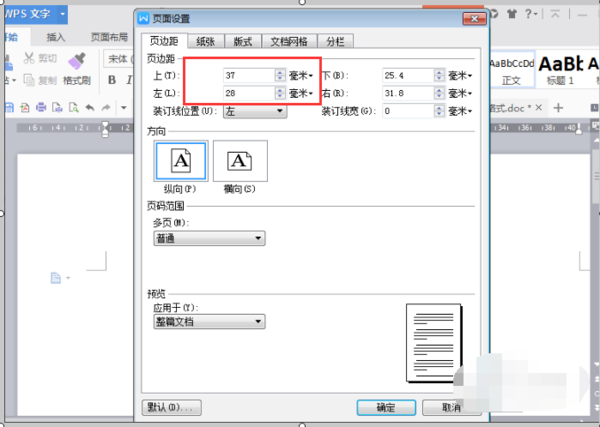 1.新建一个空白文档,点击页面布局里的页面设置,将纸张的页边距“上”设置37、“左”设置为28后点击确定。