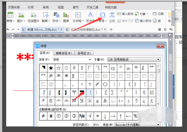 注:文号一定要使用六角符号。六角符号插入方法:选择“插入”——“符号”——“符号”附签,找到六角符号后,将光标置于准备插入的地方,单击“插入”按钮即可。
