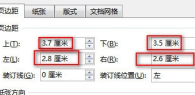 2、设置为: 3.7 厘米, 底部: 3.5 厘米, 左: 2.8 厘米, 右2.6 厘米。