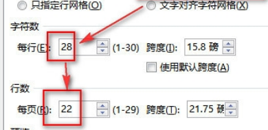 5、确定后, 返回到 "文档样式" 选项卡. 选择 "指定行网格和字符样式", 将每行设置为28个字符, 并将每页设置为22行。然后单击 "确定" 关闭对话框。