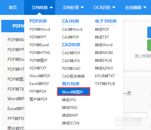 进入主页,点击导航栏里面的文档转换后会出现一个很大的下拉框,我们在下拉框的图片转换里面找到“Word转图片”并点击进去。