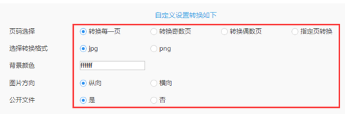 将下面的转换格式、页码选择、背景颜色、还有图片方向进行设置一下,用这些参数来给图片定义大小。