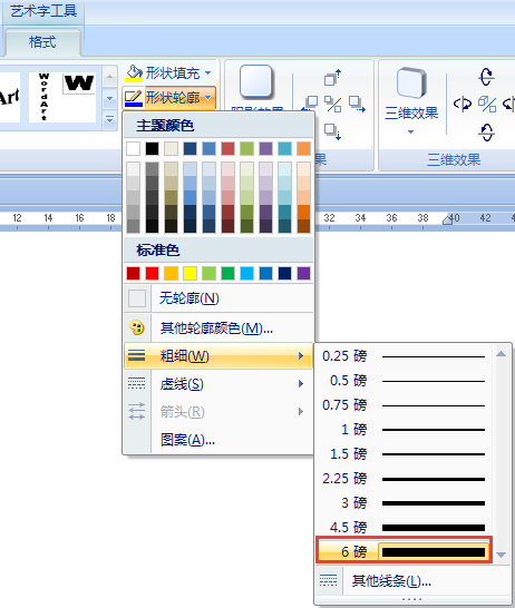 3、单击艺术字工具格式----形状轮廓----粗细----6磅即可,如图所示。