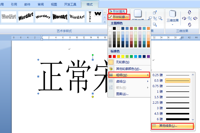 3、如果要加粗的字不是太多,可以通过插入艺术字的方法加粗:点击艺术字,输入要加粗的字,页面上会出现艺术字,点击“形状填充”使艺术字成为实体,再依次点击“形状轮廓”、“粗细”,可以选择粗细的磅值。见图1。如果还不够粗,再点击“其他线条”,在打开的设置框中,加大线条的磅值“确定”。见图2。