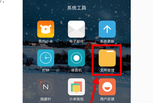 4.接下来我们按照下图中红色箭头指示位置点击“文件管理”进入到手机的文件管理系统,如下图:
