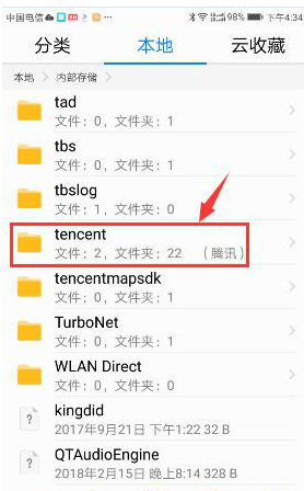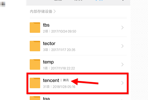 2、在手机文件夹中,找到名为tencent(腾讯)的文件夹,点击进入。