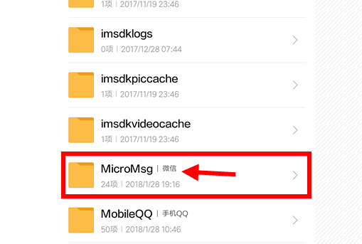 3进入子文件夹之后,我们可以在列表中找到一个“MicroMsg”(micro massage微信的缩写);