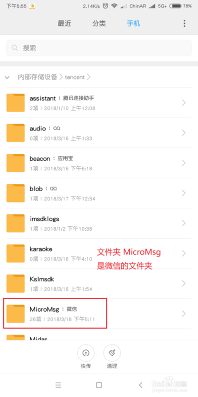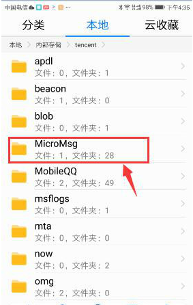2然后我们在本地的文件夹列表中,找到 [tencent] 文件,这个就是我们微信的根文件夹,点击进入。