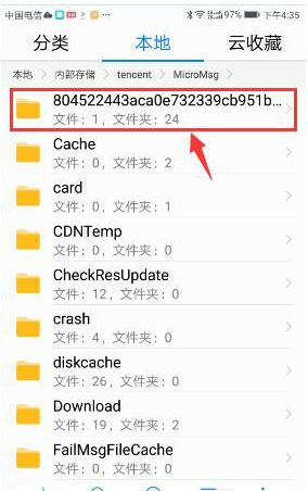 5我们在文件列表中找到一个文件夹名称为一长串字母与数字组合起来的串号文件夹,这个就是存放我们微信记录的文件夹。