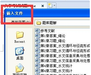4、这个时候在“打开文件”对话框中选择中插入文件。这个时候你会发现这个时候已经可以插入文件了。