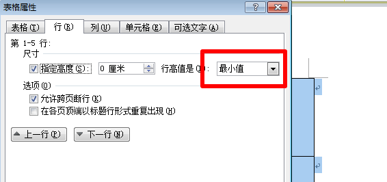 3、然后我们点击“行高值是”后面的小倒三角形选择“最小值”即可。