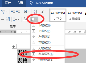 3、然后点击表格工具中的“框线”选项,在下拉菜单中点击“所有框线”。