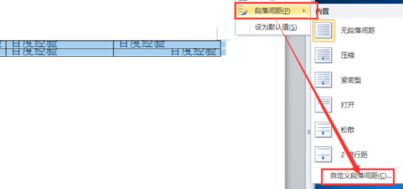 3、然后我们在弹出来的窗口中点击打开段落间距中的“自定义段落间距”。