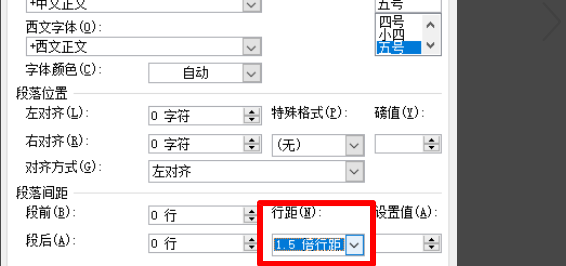 4、然后我们在弹出来的窗口中点击打开设置默认值下面的间距,设置成“1.5倍行距”,然后回车确定就可以了。