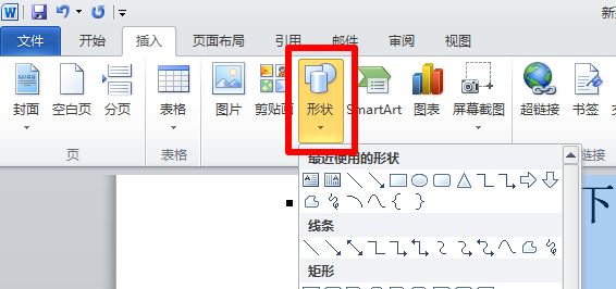 1、首先我们打开需要编辑的word文档,点击打开插入中的“形状”后面的倒三角形。