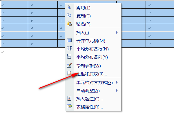 2.打开文档后,选中需要设置的表格,然后单击右键鼠标,在弹出的对话框中选择“边框和底纹”。